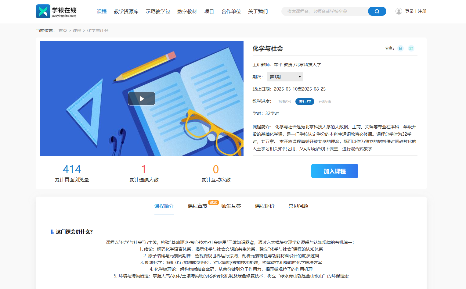 课程内容:程以"化学与社会"为主线,构建"基础理论-核心技术-社会应用"三维知识图谱,通过六大模块实现学科逻辑与认知规律的有机统一:
