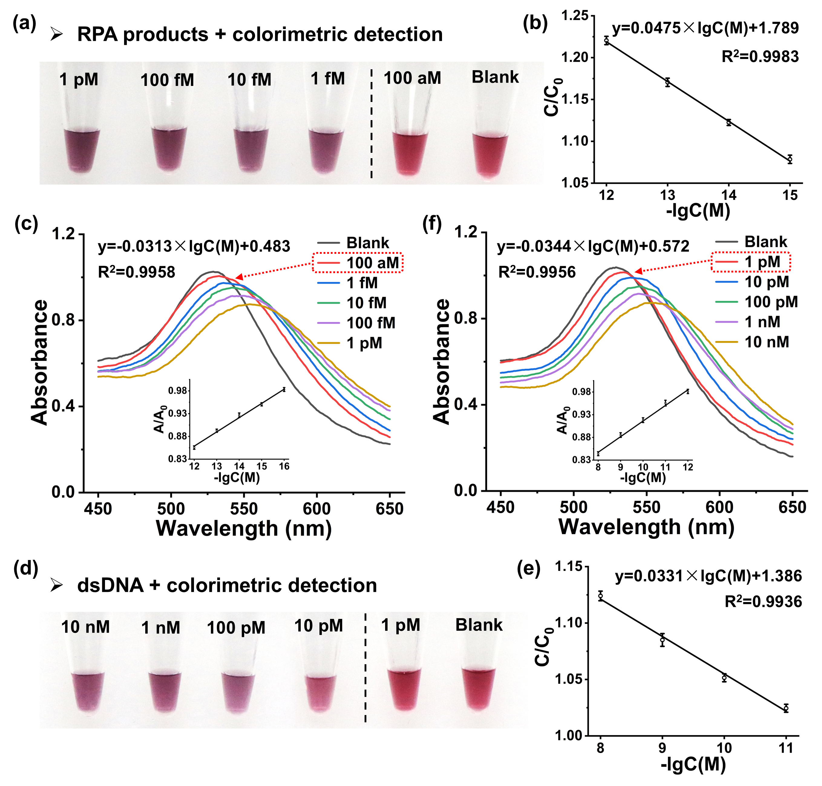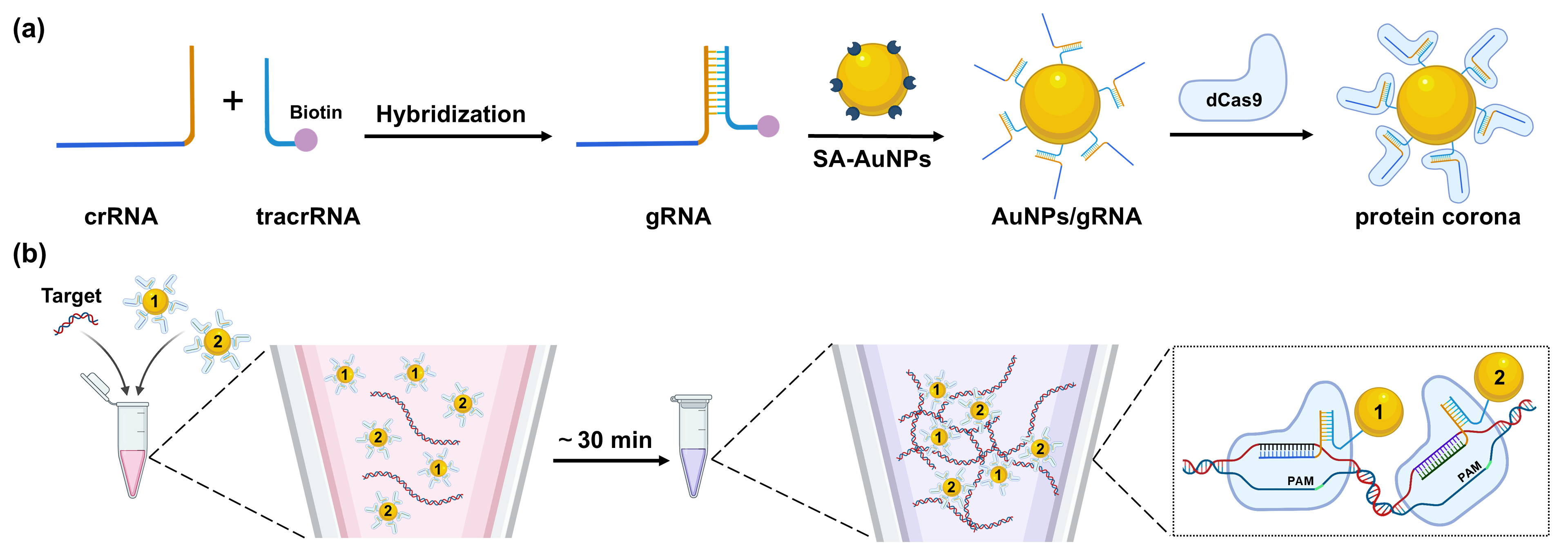 首先,将crRNA与biotin修饰的tracrRNA结合形成向导RNA(gRNA),结合于链霉亲和素功能化的AuNPs(SA-AuNPs)表面,形成内层gRNA-外层dCas9蛋白的人工蛋白冠。针对一个目标分子,设计两条gRNA分别构建两个蛋白冠。当目标核酸存在时,两个蛋白冠可通过gRNA杂交至同一核酸链的邻近位置,诱导 AuNPs 交联聚集,并产生由红到紫的颜色变化。该研究与恒温扩增技术(如 RPA、RT-RPA)结合,采用“一锅一步法”在30分钟内可用肉眼快速识别出低至1 fM的目标核酸,满足资源有限场景下大规模筛查的需要。此外,作者通过RGB颜色分析法和UV-vis光谱检测法提高检测灵敏度,可实现低至100 aM目标分子的定量分析。