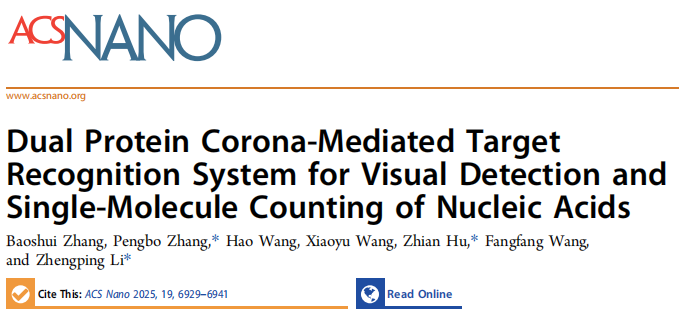 以上研究成果以"Dual Protein Corona-Mediated Target Recognition System for Visual Detection and Single-Molecule Counting of Nucleic Acids"为题发表在国际学术杂志《ACS Nano》(ACS Nano 2025, 19, 6929−6941,一区TOP,IF = 15.8)。